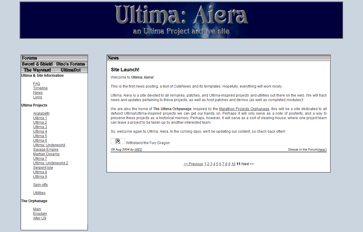 August 9th, 2004. That was the day I first posted something to the original Ultima: Aiera, way back in the day when I still bothered including a colon in the site’s name. The first site was, if memory serves, hosted on the webspace given to me as a student of the Computer & Electrical Engineering faculty at the University of Alberta.