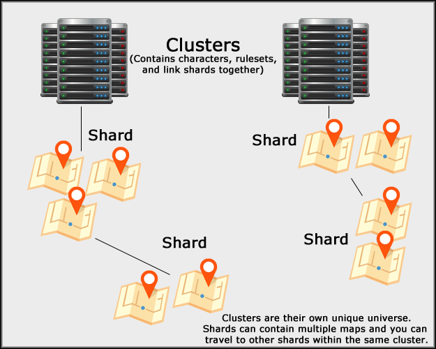 The game world isn’t a single “world” but a group of servers, referred to as clusters, each one running its own unique universe. Before I get too far into trying to explain it, check out this flow-chart I made: